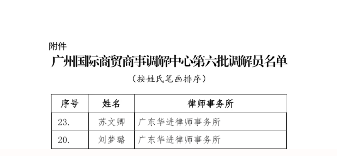 近日,广州国际商贸商事调解中心第六批调解员聘任名单在广州市律师协会官网正式公布,经过征集遴选、调解实务培训及考核,广东华进律师事务所监事会主席苏文卿律师、合伙人刘梦璐律师凭借深厚的专业素养、丰富的商事争议解决经验成功入选,正式获聘为广州国际商贸商事调解中心第六批调解员。