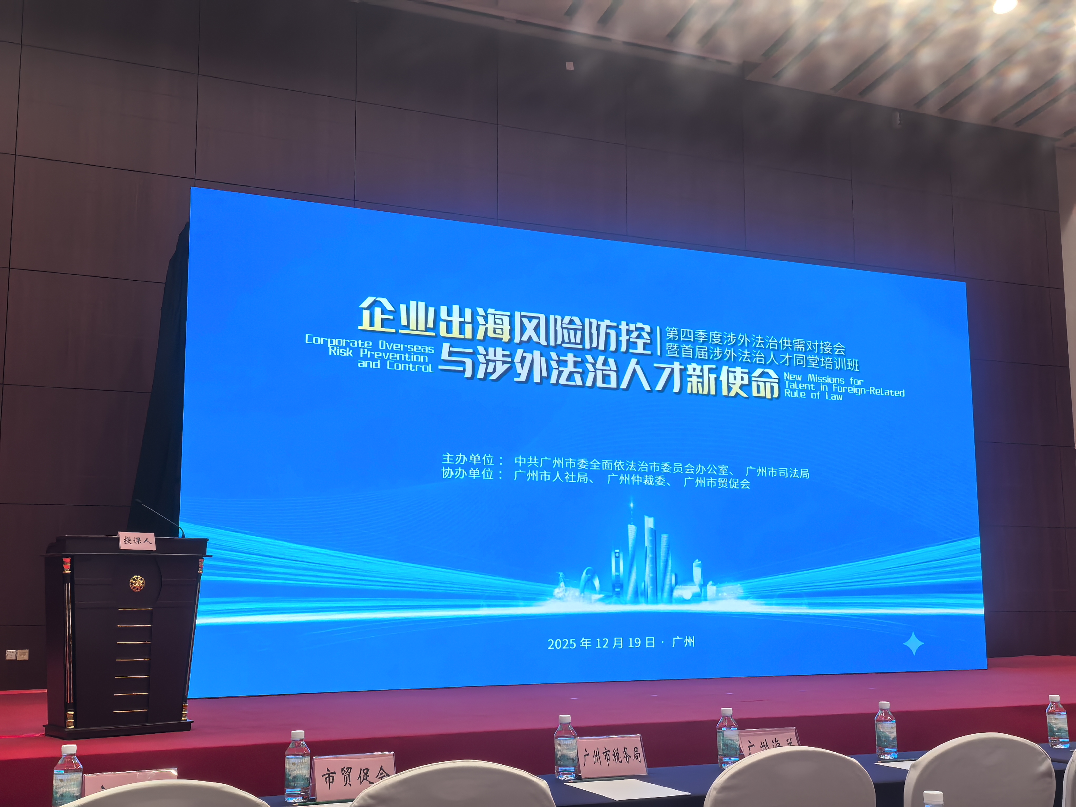 12月19日下午,“企业出海风险防控与涉外法治人才新使命”——第四季度涉外法治供需对接会暨首届涉外法治人才同堂培训班在广州白云国际会议中心隆重举办。此次活动由中共广州市委全面依法治市委员会办公室、广州市司法局主办,广州市人社局、广州仲裁委、广州市贸促会联合协办,以提升涉外法治人才专业素养、赋能企业“走出去”战略落地为核心宗旨,吸引百余名政、企、法各界代表齐聚一堂,共探涉外法治建设新路径。