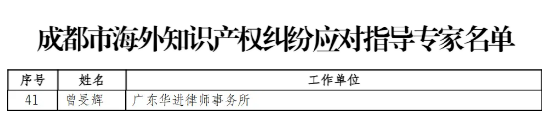 华进喜讯|华进曾旻辉律师入选成都市海外知识产权纠纷应对指导专家名单