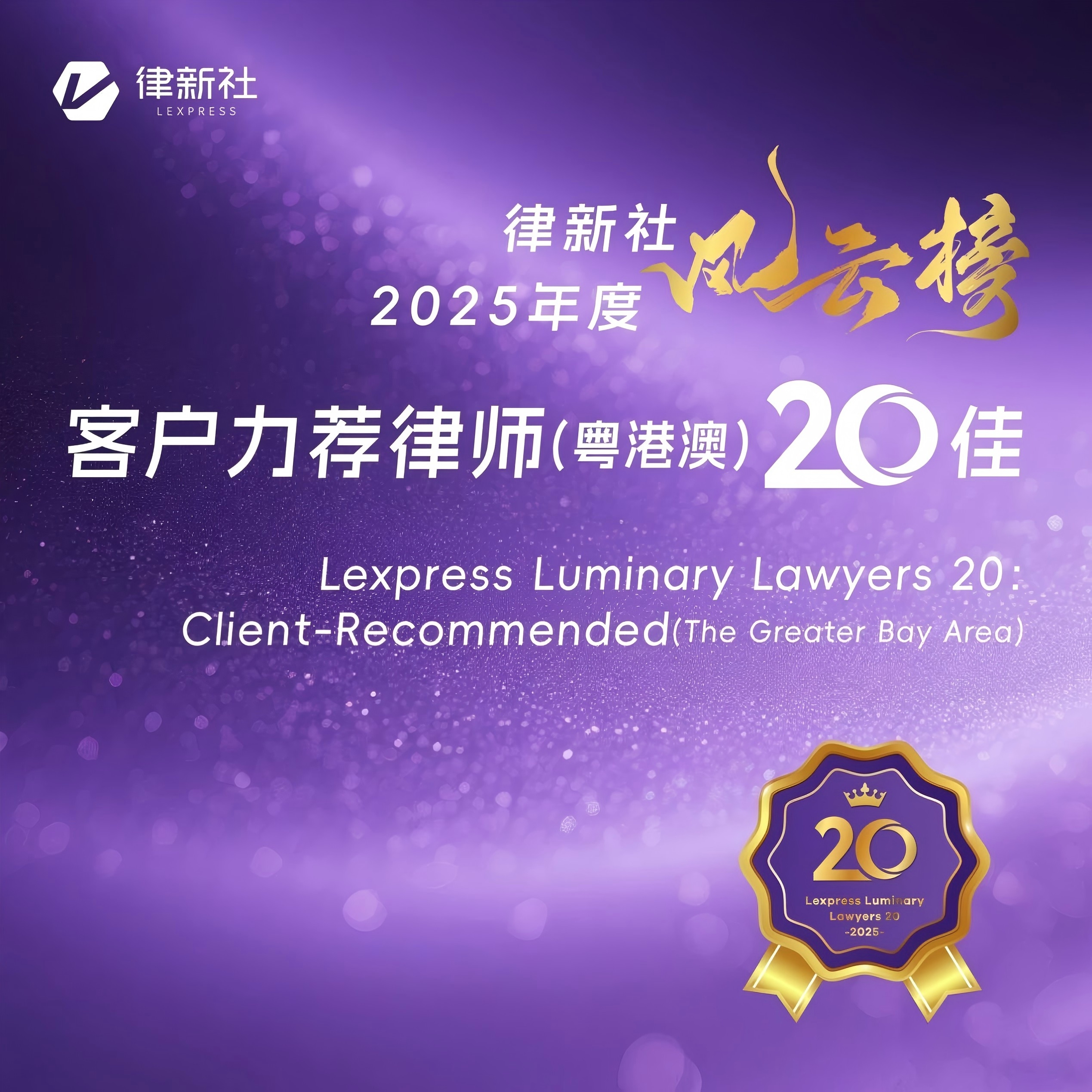 2026年1月27日,备受律师行业关注的律新社2025年度风云榜评选结果正式发布。历经多轮严苛审核、专业评审团综合评议及海量的客户口碑调研,华进所监事会主席、公司股权研究院院长苏文卿律师凭借扎实深厚的专业功底、丰富多元的实战经验与广受赞誉的客户口碑,从粤港澳大湾区众多优秀律师中脱颖而出,成功获评 “客户力荐律师(粤港澳)20佳”。