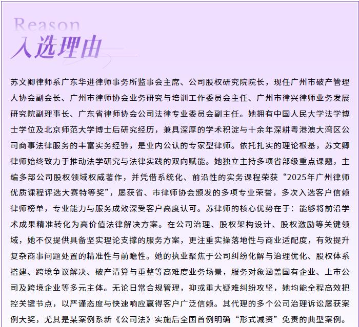 华进喜讯|苏文卿律师荣膺律新社2025年度风云榜“客户力荐律师(粤港澳)20佳”